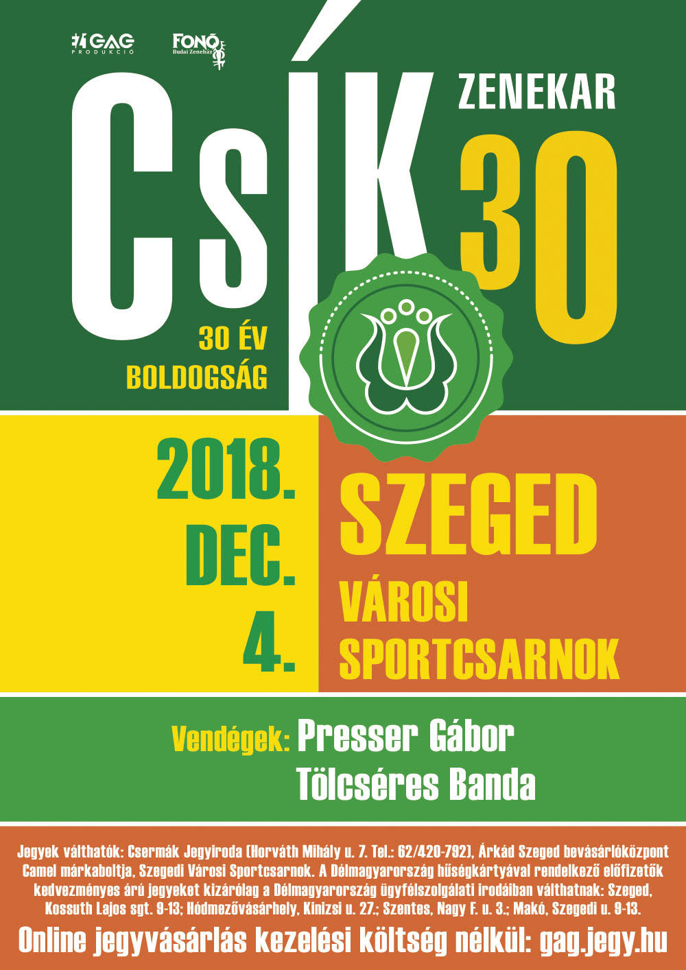 2018. december 4‑én, kedden 19 órától Szegeden, a Városi Sportcsarnokban (Temesvári körút 33.) játszik a Csík Zenekar, a koncert vendége Presser Gábor és a Tölcséres Banda lesz.