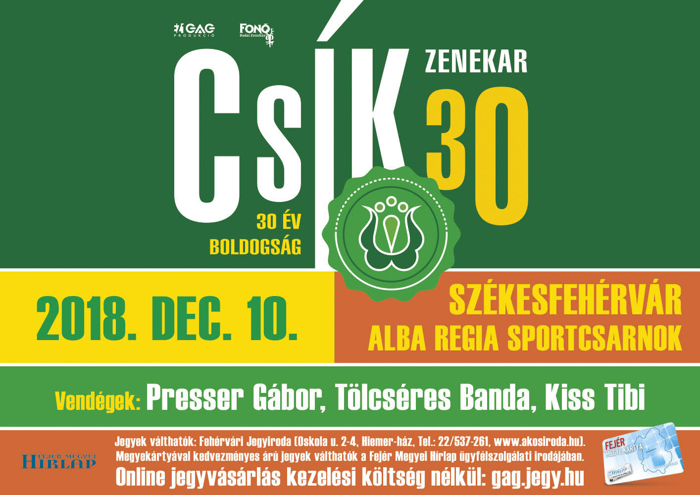 2018. december 10‑én, hétfőn 19 órától Székesfehérváron, az Alba Regia Sportcsarnokban (Gáz u. 19.) játszik a Csík Zenekar, a koncert vendége Presser Gábor, Kiss Tibi és a Tölcséres Banda lesz.