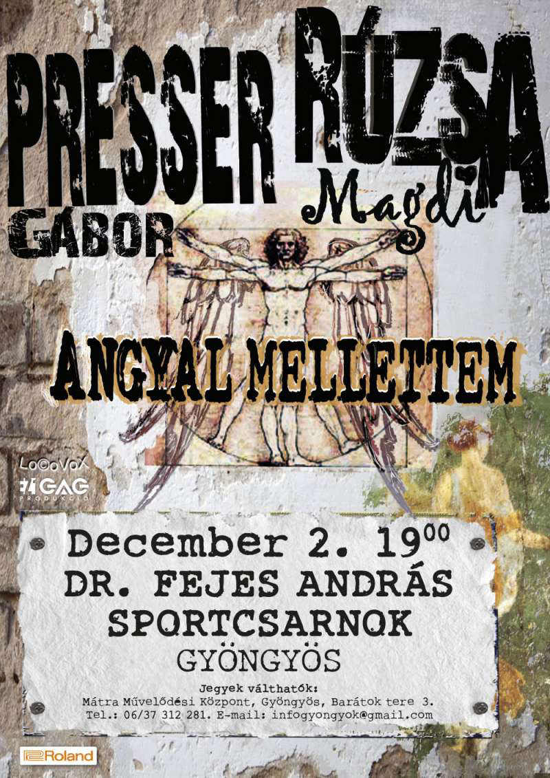 December 2‑án, vasárnap 19 órától Gyöngyösön, a Dr. Fejes András Sport- és Rendezvénycsarnokban (Kiss Péter u. 2.) koncertezik Presser Gábor és Rúzsa Magdi, Angyal mellettem című közös előadásukkal. A koncertre jegyek válthatók a Mátra Művelődési Központban (Barátok tere 3., tel.: 37/312281, ).