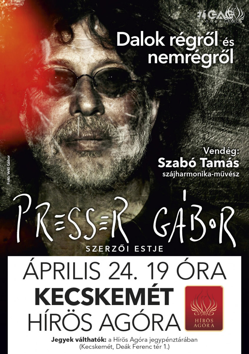 Április 24‑én, kedden 19 órától Kecskeméten, a Hirös Agórában (Deák Ferenc tér 1.) koncertezik Presser Gábor. A Dalok régről és nemrégről című szerzői est vendége Szabó Tamás szájharmonika-művész. A koncertre néhány jegy még kapható a Hirös Agóra jegypénztárában: Deák Ferenc tér 1., tel.: 76/503897; munkanapokon 1419 óra között.