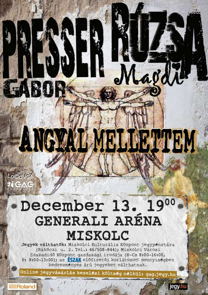 December 13‑án, csütörtökön 19 órától Miskolcon, a Generali Arénában (Görgey Artúr u. 19.) koncertezik Presser Gábor és Rúzsa Magdi, Angyal mellettem című közös előadásukkal. A koncertre jegyek válthatók a Miskolci Kulturális Központ jegypénztárában (Rákóczi u. 2. tel.: 46/508844), a Miskolc Városi Szabadidőközpont gazdasági irodájában (Görgey Artúr u. 19., tel.: 46/506442, hétfőtől csütörtökig 8 és 16 óra között, pénteken 8 és 13 óra között), valamint a Gagmanagement Produkciós és Reklámiroda weblapján. Az Észak-Magyarország előfizetői korlátozott mennyiségben kedvezményes árú jegyeket válthatnak.
