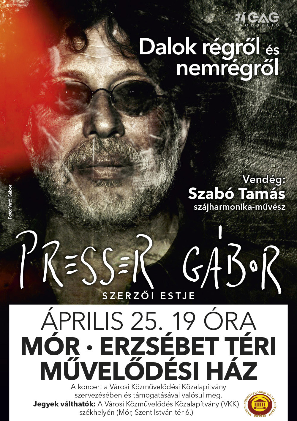 Április 25‑én, szerdán 19 órától Móron, az Erzsébet téri Művelődési Házban (Erzsébet tér 14.) koncertezik Presser Gábor. A Dalok régről és nemrégről című szerzői est vendége Szabó Tamás szájharmonika-művész. A koncertre minden jegy elkelt.