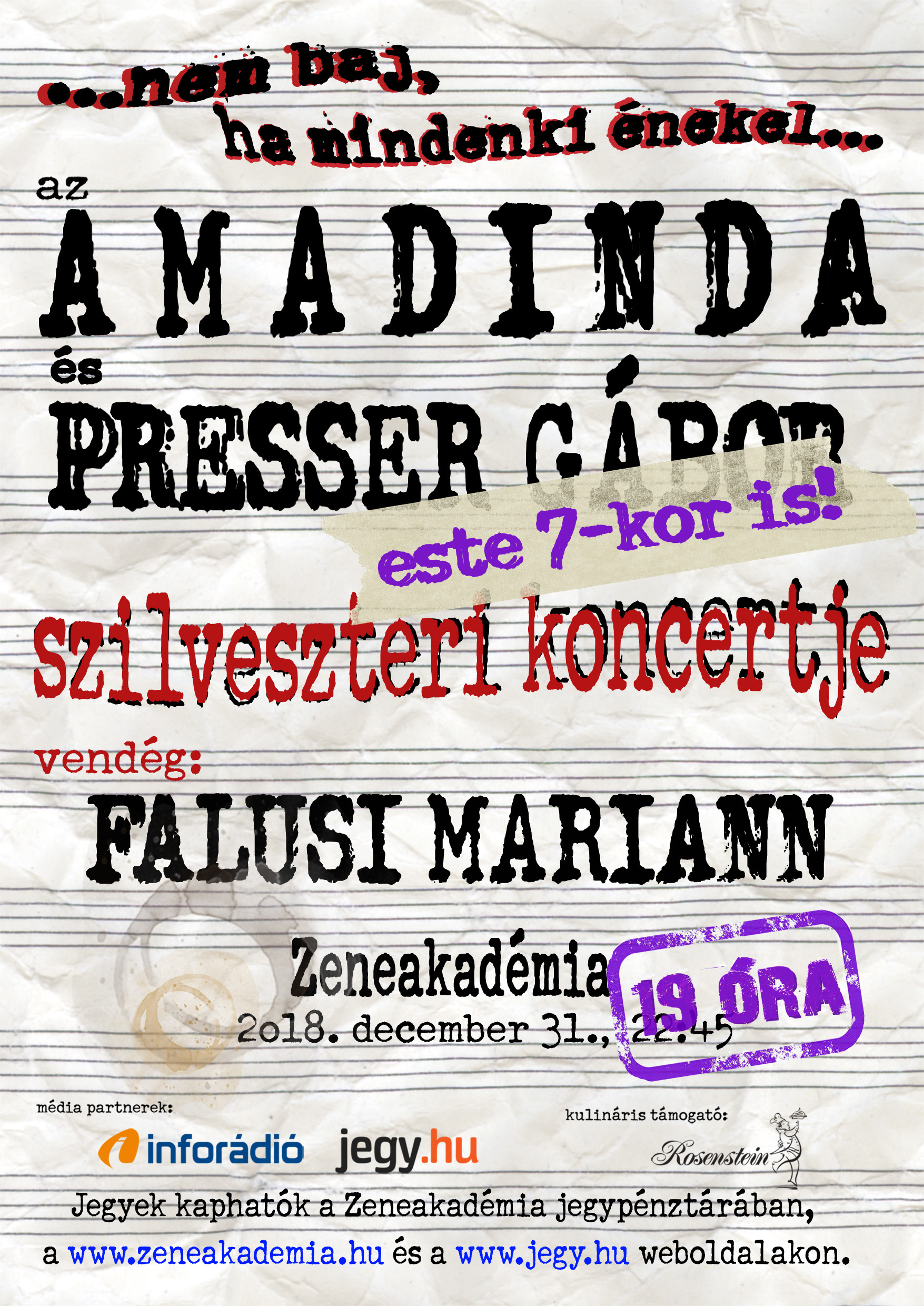 Az Amadinda és Presser Gábor hagyományos óévbúcsúztatóújévet köszöntő hangversenyeinek egyik legfőbb vonzerejét azok a produkciók jelentik, melyek ritkán vagy soha nem hangzottak még el, vagy kizárólag egyszer, ez alkalommal hallhatók. A közönség közel két évtizedes érdeklődésére jellemző, hogy a koncertek évről évre telt házak előtt zajlanak, sokan már hetekkel-hónapokkal az újabb koncert előtt biztosítják helyeiket. Az idei, tizennyolcadik szilveszter vendége az egyedülálló hanggal megáldott Falusi Mariann lesz, aki már évek óta dolgozik együtt Presser Gáborral, sőt közös szobalemezt is készítettek. A koncert első része hagyományosan az Amadinda repertoárjának legnépszerűbb darabjaiból épül fel. Az éjfél előtti perceket Johann Sebastian Bach zenéje, az utolsó óévi pillanatokat az Amadinda gongjainak zúgása tölti ki. A második rész a megismételhetetlen pillanatoké. Az újév első produkciója hagyományosan egy Strauss-polka, majd színpadra lép az est másik házigazdája, Presser Gábor. A számtalan ütőhangszerrel és zongorával felpakolt zenevonat végül az erre az alkalomra áthangolt LGT-dalokkal ér a végállomásra Beharangozó a Zeneakadémia Koncertközpont weblapján. Az esti előadás december 31‑én 19 órakor, az éjféli koncert 22.45‑kor kezdődik a Zeneakadémia Nagytermében (VI., Liszt Ferenc tér 8.). Jegyek válthatók a Jegy.hu online jegyirodában.