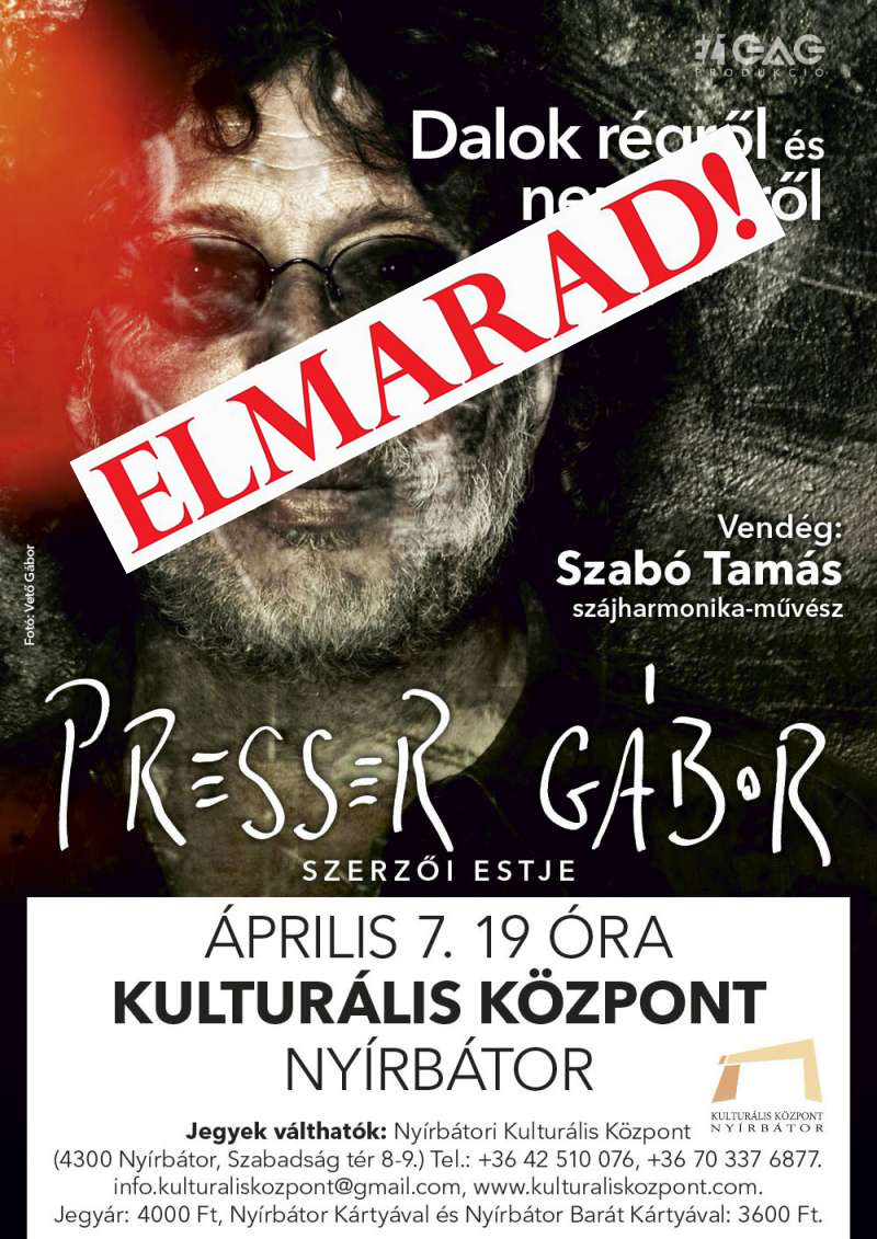 Március 3‑án, kedden 19 órától Révkomáromban, az Egressy Béni Városi Művelődési Központban (Hradná 1.) ad koncertet Presser Gábor és vendége. Jegyek kaphatók a VMK jegypénztárában, tel.: +421 905 892 579.