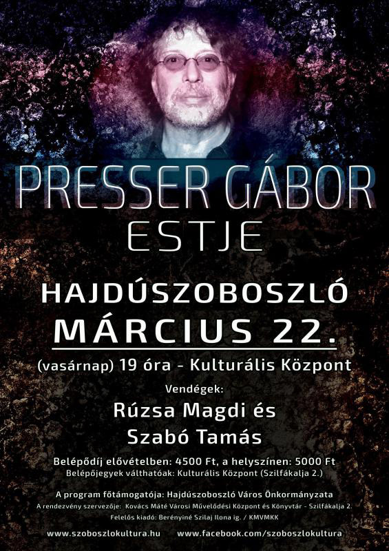 Március 22‑én, vasárnap Hajdúszoboszlón, a Kovács Máté Városi Művelődési Központban koncertezik Presser Gábor. A Dalok régről és nemrégről című szerzői est vendége Szabó Tamás szájharmonika-művész és Rúzsa Magdi.
