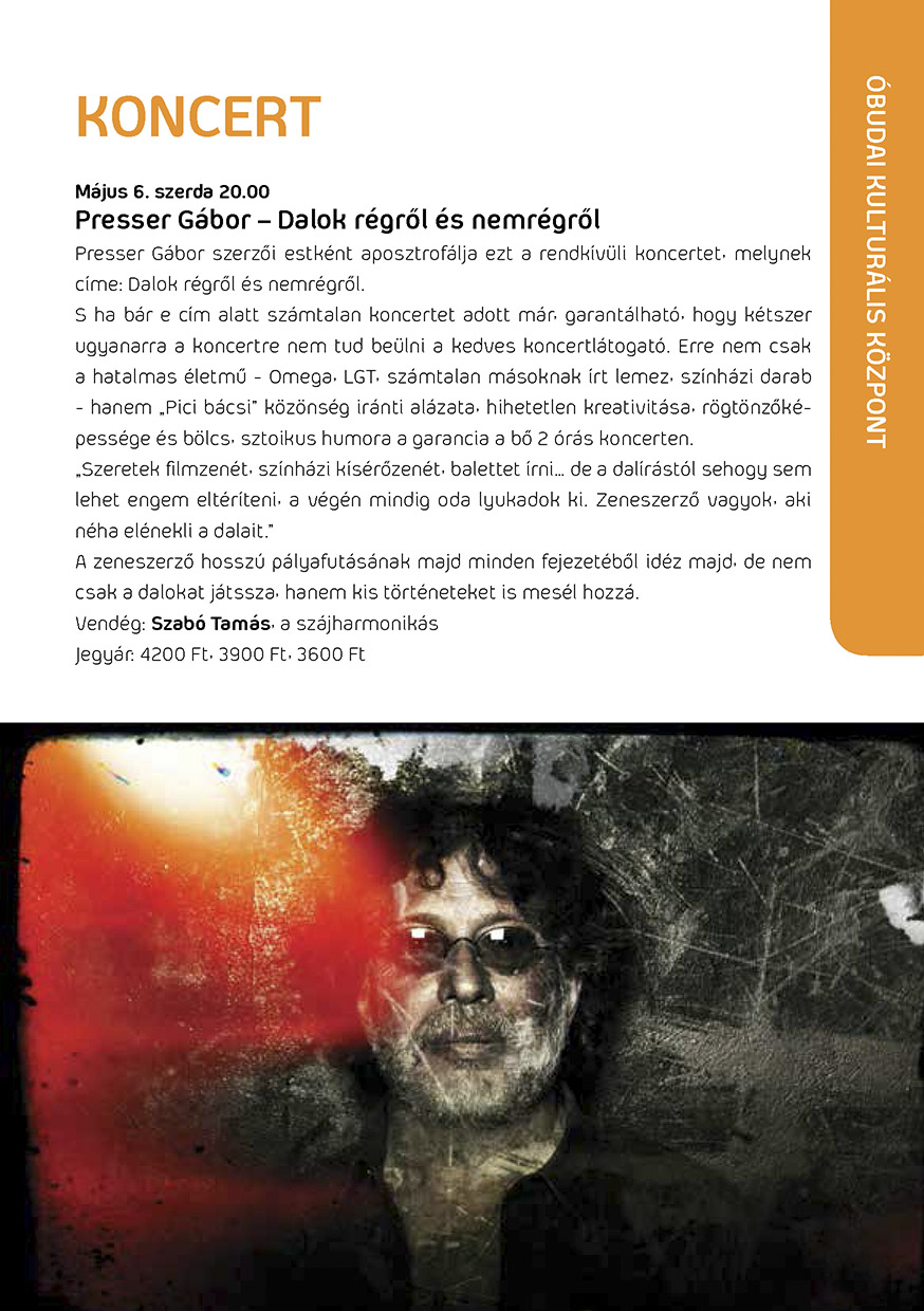 Május 6‑án, szerdán 20 órakor az Óbudai Kulturális Központban koncertezik Presser Gábor. A Dalok régről és nemrégről című szerzői est vendége Szabó Tamás szájharmonika-művész.