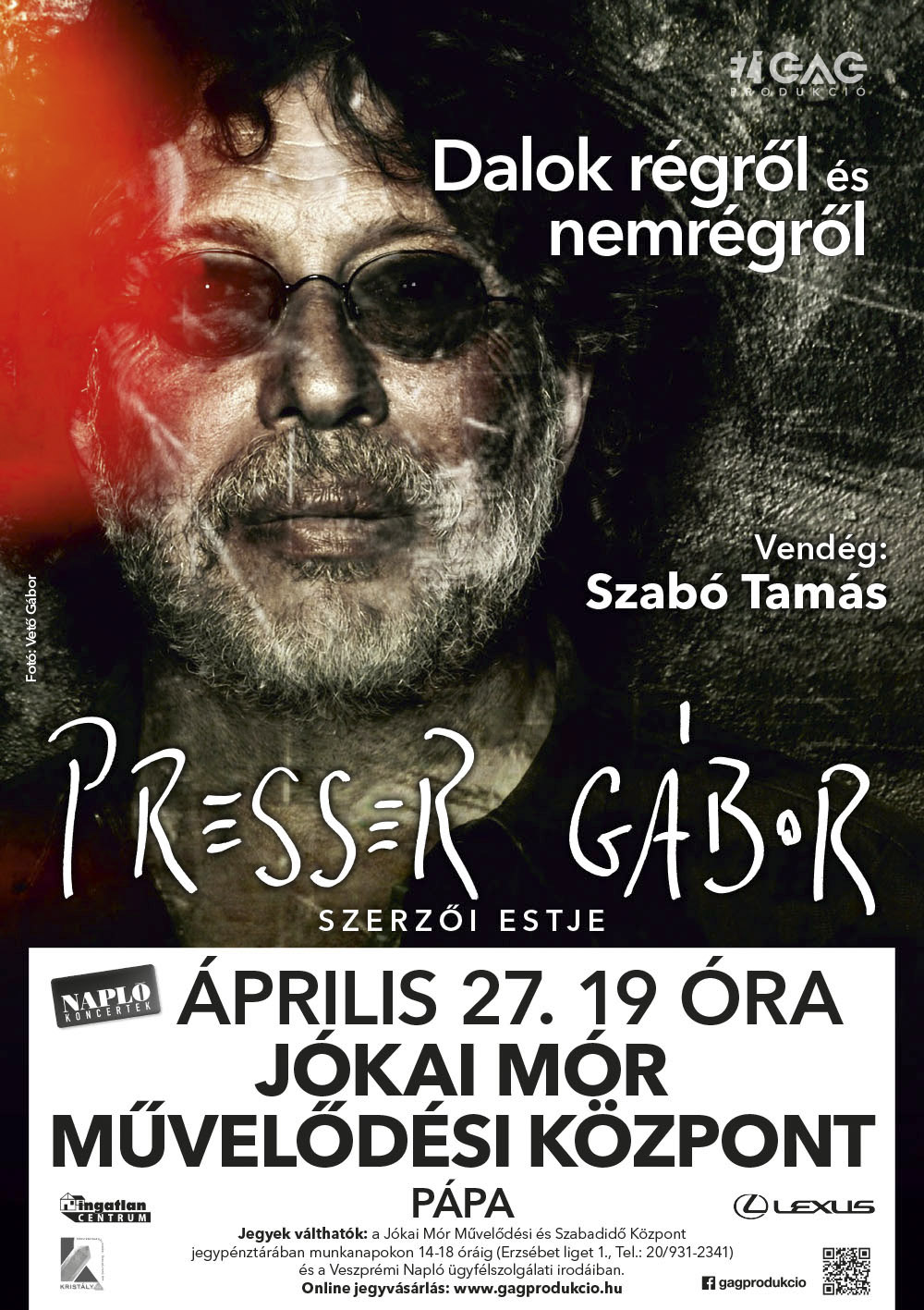 Április 27‑én, hétfőn Pápán, a Jókai Mór Művelődési és Szabadidő Központban koncertezik Presser Gábor. A Dalok régről és nemrégről című szerzői est vendége Szabó Tamás szájharmonika-művész.